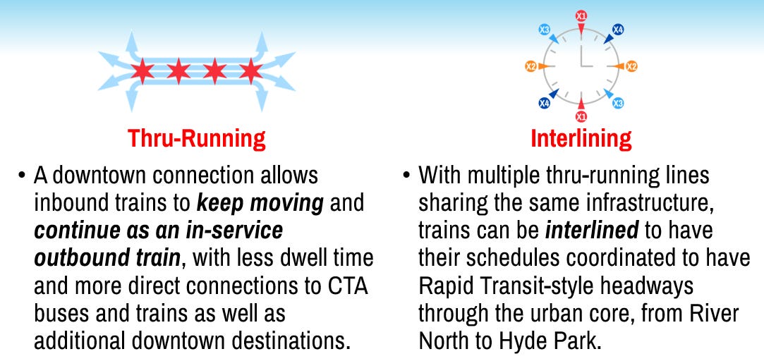 Thankfully, things are starting to change. Metra is investing in a more modern fleet, including lower-floor cars for their diesel lines and pioneering new, lighter, more nimble battery-powered single-level train sets for the Rock Island Beverly Branch, among potential other deployments. Metra has also committed to fundamentally shifting their operations from a “commuter rail” model to a “regional rail” paradigm, with a stronger emphasis on more frequent, all-day bi-directional service instead of focusing nearly exclusively on “traditional” commuting patterns in and out of downtown during rush hours. Unfortunately, these improvements may still have a relatively low ceiling for potential regional benefits, as Metra’s infrastructure is still constrained by sharing tracks with freight trains throughout the region, and Metra’s disconnected downtown terminals scattered around the edge of the Loop.