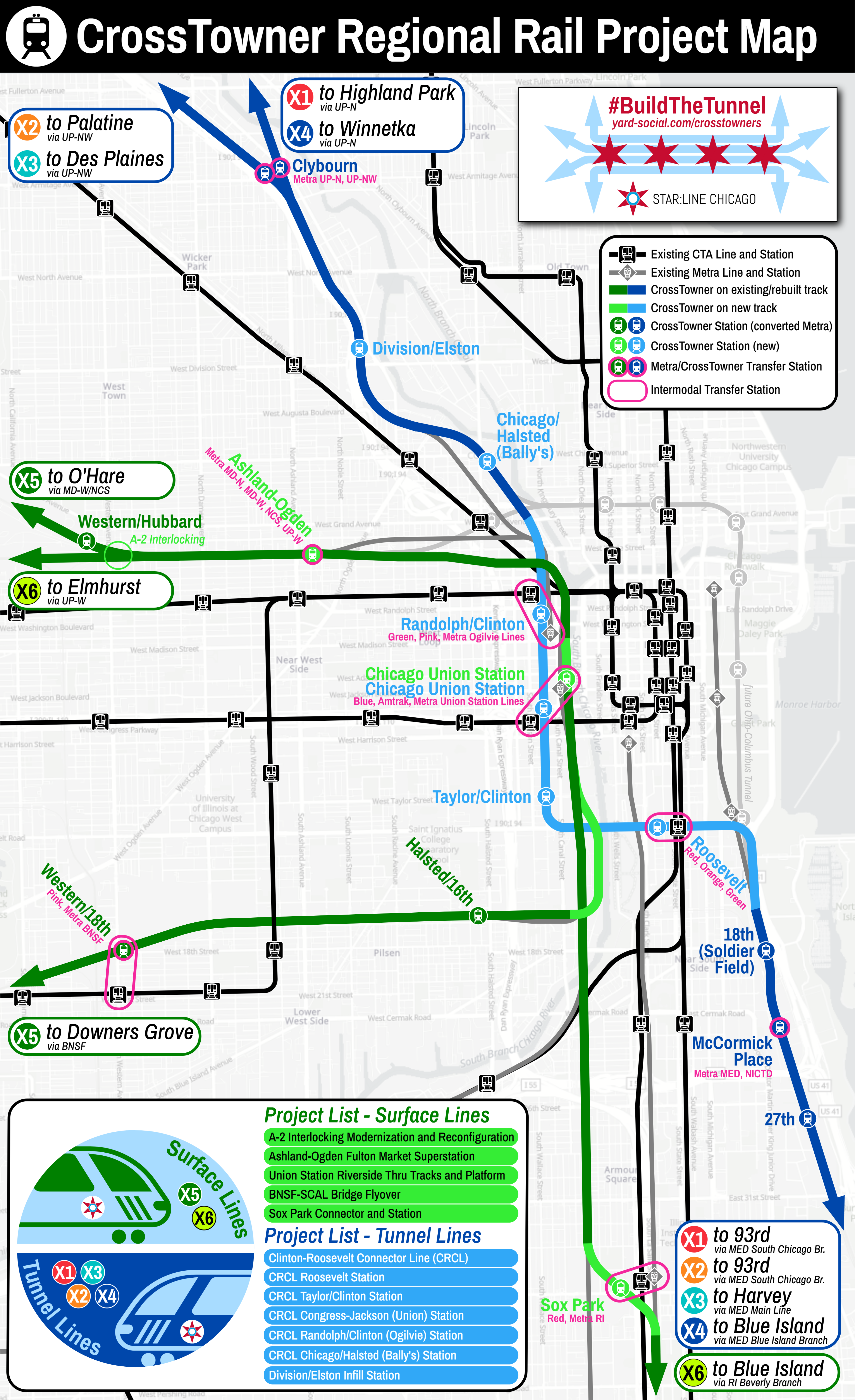 The CrossTowner Network is comprised of six individual lines: four “Tunnel Lines” that connect the Metra Electric Line with the Metra Union Pacific North and Metra Union Pacific Northwest Lines, and two “Surface Lines” that meet the Tunnel Lines at Union Station. The Tunnel Lines take advantage of existing electrification on the Metra Electric Line as well as the very low freight volumes on the Metra Union Pacific North and Northwest Lines.