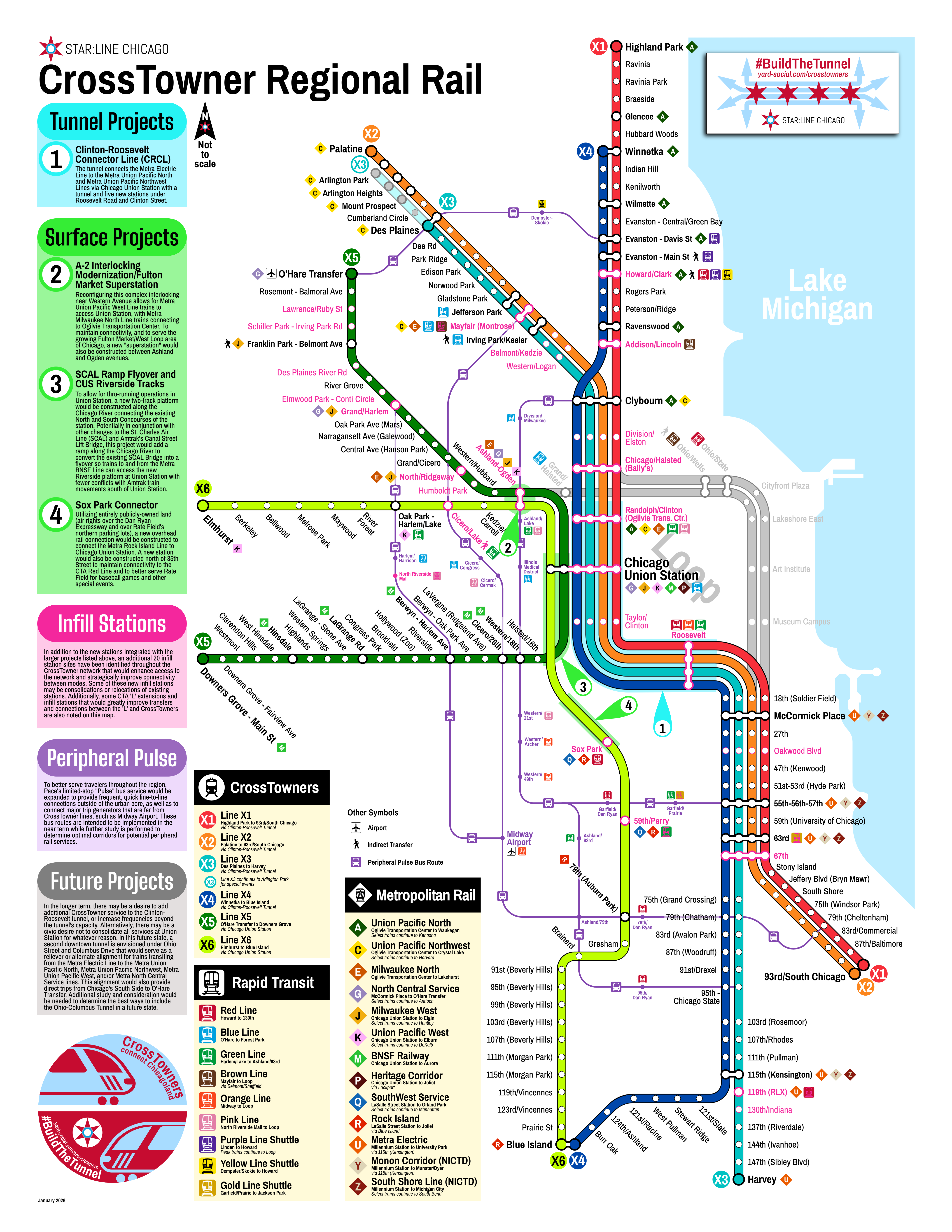 While a variety of smaller-scale enhancements and improvements would be included in the full CrossTowner concept, there are four key components to connect the Metra network together to create the backbone of the CrossTowner network.