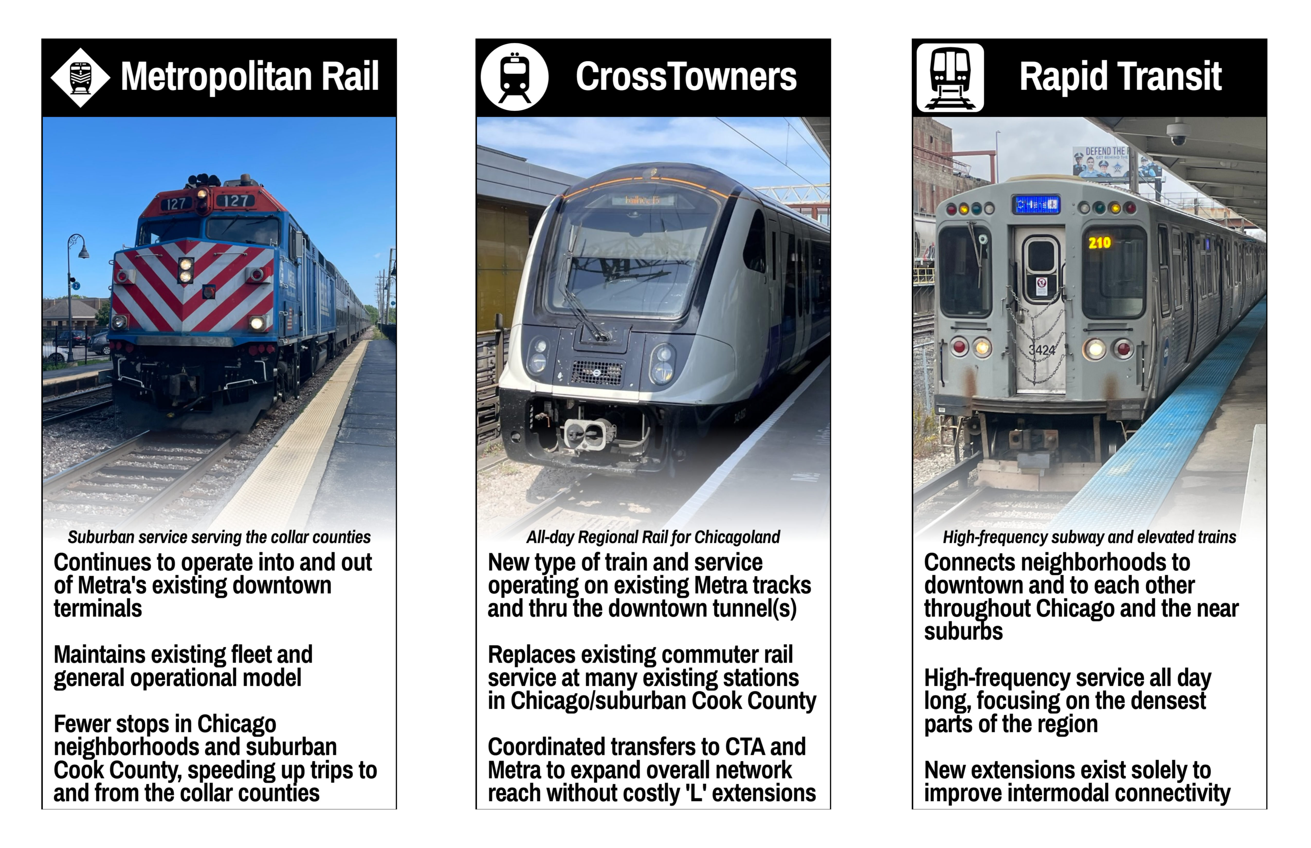 CrossTowner regional rail lines would efficiently and effectively fill the transit demands of the region’s middle tier beyond the affordable reach of Rapid Transit without degrading Metropolitan Rail service from the collar counties. City riders benefit from a wider variety of rail services offered at higher frequencies than current Metra service, while also focusing ‘L’ investments to finally move away from the CTA’s rigid hub-and-spoke rail operating model. Collar county Metra riders benefit from faster trains making fewer stops: every train is an express train. Finally, riders in the “fringe” of suburban Cook County and outer Chicago neighborhoods will have a new network of fast and frequent trains that not only run to downtown but thru and beyond it, with additional direct connections to Metra trains and CTA trains throughout the region.